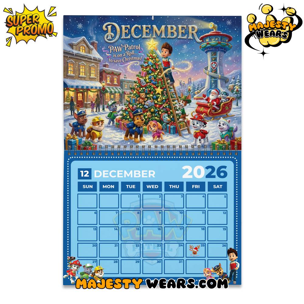 Turning to the internal pages, the Paw Patrol 2026 Wall Hanging Calendar continues the adventure with detailed monthly scenes like the December Christmas rescue. In this portion of the Paw Patrol 2026 Wall Hanging Calendar, Ryder and the pups are seen decorating a massive tree while Santa flies overhead in his sleigh. The layout of the Paw Patrol 2026 Wall Hanging Calendar includes a clean blue date grid with character icons in the corners, providing a professional yet whimsical finish. Furthermore, the sturdy spiral binding allows the calendar to hang perfectly flat against any surface, ensuring easy viewing and writing throughout the changing seasons.