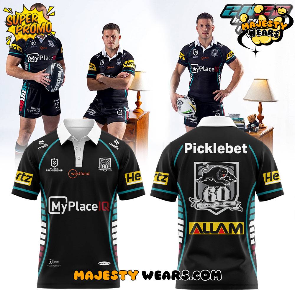The back of the Penrith Panthers Heritage 2026 Polo Shirt is dominated by a large, classic Penrith Panthers logo, framed by a banner that reiterates the “60 Seasons 1967-2026” milestone. The inclusion of player personalization, such as “Picklebet,” along with other sponsor branding like ALLAM, gives the shirt an authentic, match-day feel while underscoring the team’s professional partnerships. The back design ensures that your loyalty is visible from any angle, making a strong statement of support for the club’s rich legacy and its current roster. This visual emphasis on both historical and contemporary elements creates a dynamic and appealing piece of merchandise.