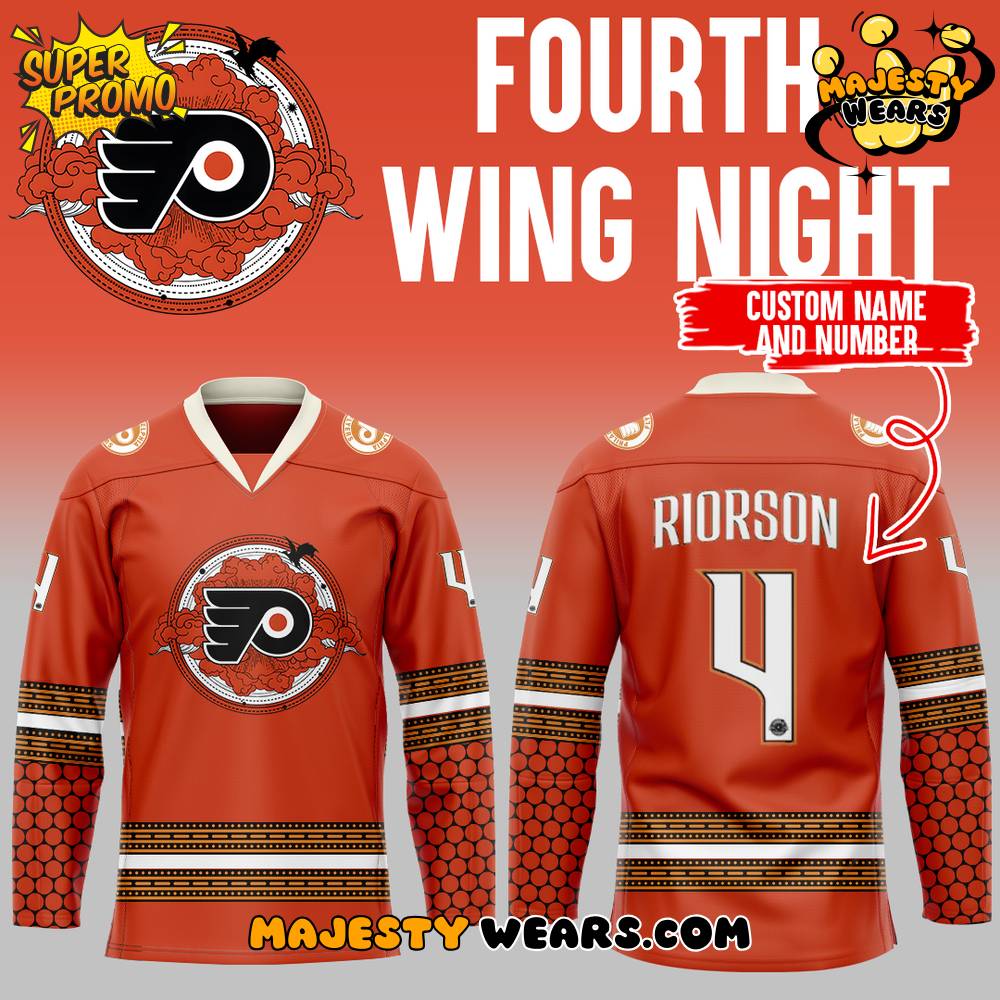 The Philadelphia Flyers Fourth Wing Night Custom Hockey Jersey is a stunning commemorative garment celebrating a unique collaboration between the NHL and the world of high fantasy. Designed for the official “Fourth Wing Night” at Xfinity Mobile Arena on March 9, 2025, this Philadelphia Flyers Fourth Wing Night Custom Hockey Jersey honors the bestselling novel by Rebecca Yarros. This Philadelphia Flyers Fourth Wing Night Custom Hockey Jersey serves as a bridge between the “New Era of Orange” and the fierce spirit of the Riders Quadrant, making it a rare and essential addition for any dedicated fan.