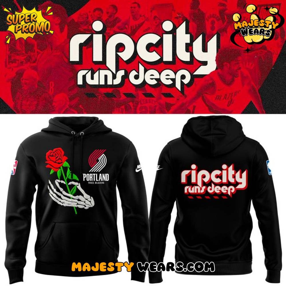 The phrase “RIP CITY RUNS DEEP” is prominently displayed on the sleeve and/or main body of the garment, often utilizing the team’s classic black, red, and white color scheme to establish clear brand Authoritativeness. This text ensures the message of profound team loyalty is immediately visible and acts as a constant reminder of the phrase’s enduring significance within the Portland Trail Blazers community. The black color of the hoodie provides a perfect canvas for the vivid red and white graphics, giving the entire piece a sleek, modern look that promotes Trustworthiness in its fashionable design execution.