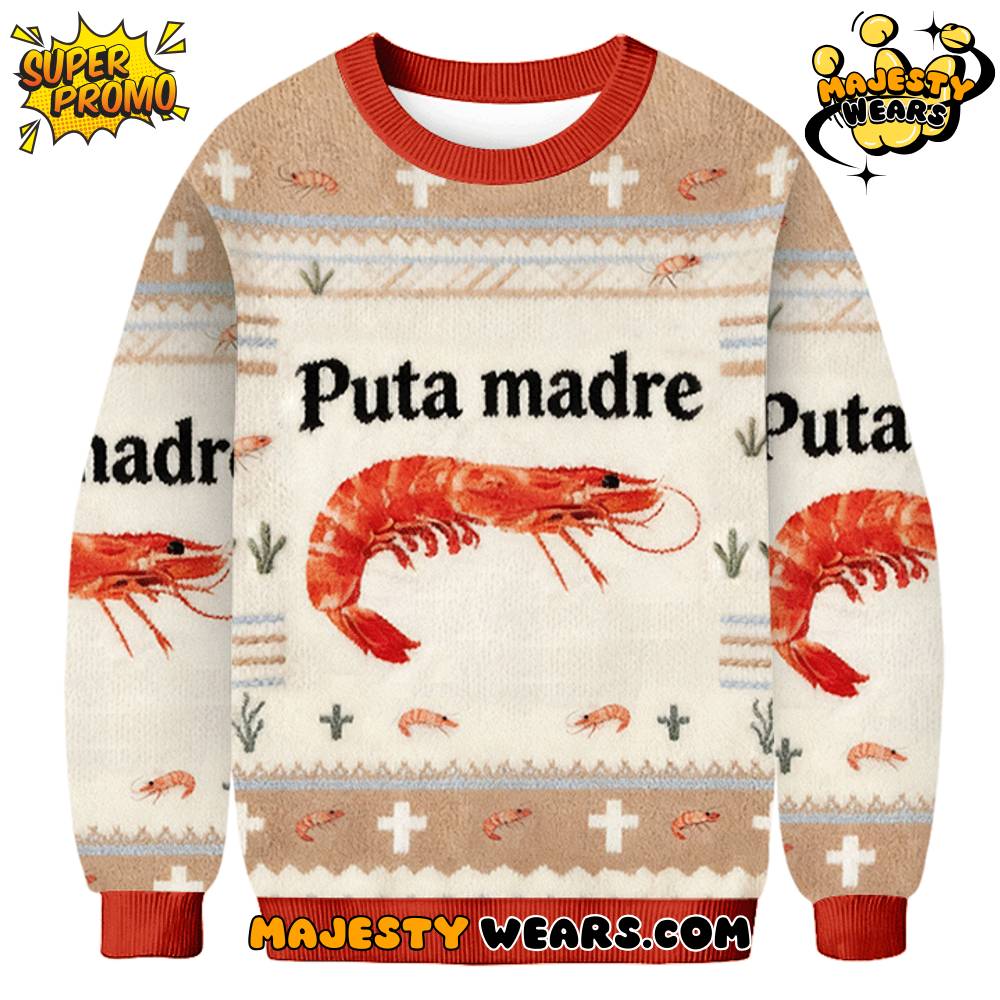 The visual appeal of the Puta Madre Ugly Christmas Sweater is centered around its vibrant and high-contrast color palette, which features a deep holiday red and festive blue that instantly catches the eye. As shown in the design, the central graphic depicts a stylized, retro-inspired shrimp—a playful nod to the traditional seafood feasts enjoyed during Christmas in many cultures. This specific Puta Madre Ugly Christmas Sweater uses a detailed pixel-art style for the shrimp, giving it a nostalgic 8-bit video game feel that is popular in 2025 fashion. Every element of the Puta Madre Ugly Christmas Sweater is meticulously placed to create a balanced composition that feels both intentionally “ugly” and artistically cohesive.