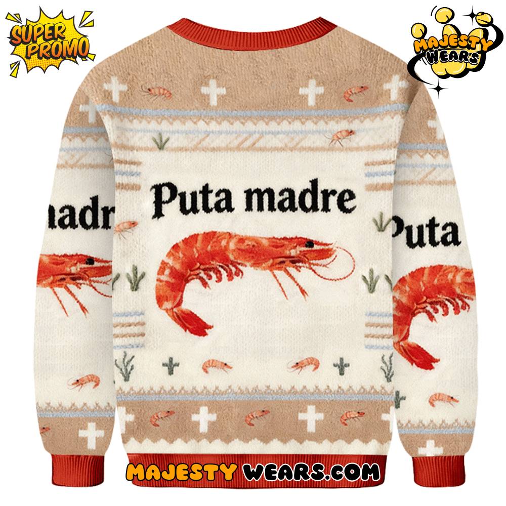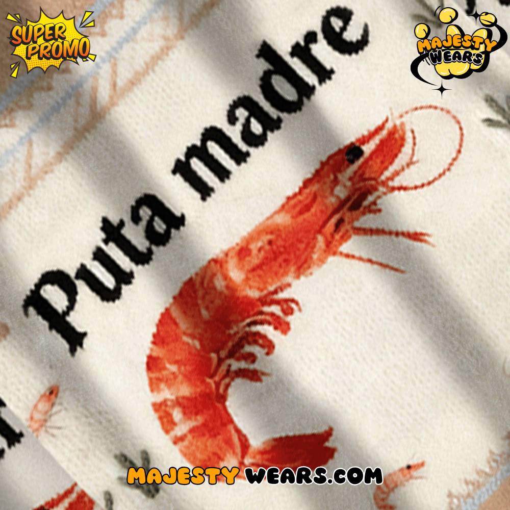 Typography plays a critical role in the impact of the Puta Madre Ugly Christmas Sweater, with the eponymous phrase rendered in a bold, white font that contrasts sharply against the background. Below the central shrimp graphic, the text is framed by classic Nordic-inspired patterns, including snowflakes and geometric lines that are synonymous with the “ugly sweater” genre. The Puta Madre Ugly Christmas Sweater also features small accent motifs like tiny stars and cross-stitches that fill the negative space, adding to the garment’s textured and busy appearance. This attention to detail in the Puta Madre Ugly Christmas Sweater ensures that the humorous message remains the focal point while still respecting traditional holiday design tropes.