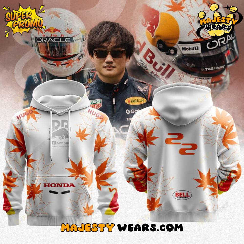 The design of the RedBull Yuki Tsunoda Premium F1 Helmet Special Hoodie is a masterclass in graphics-meets-apparel, directly translating the artwork from Tsunoda’s helmet onto a wearable canvas. The striking white base of the Special Hoodie serves as a perfect backdrop for the vibrant, repeating patterns of orange and red Japanese maple leaves (Momiji), which are a central element of the driver’s personalized racing identity. This cultural motif symbolizes national pride and is a distinct visual signature for Yuki Tsunoda, immediately setting the Premium F1 garment apart from standard team-wear.