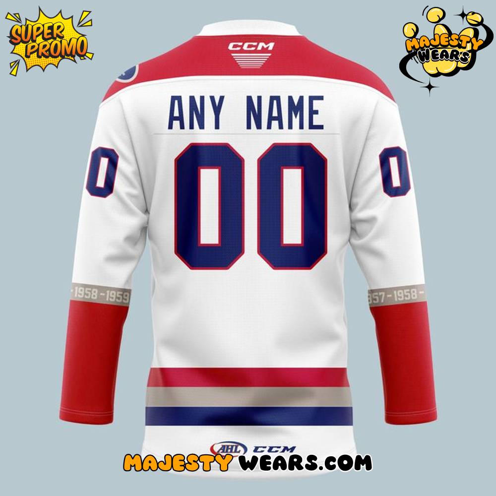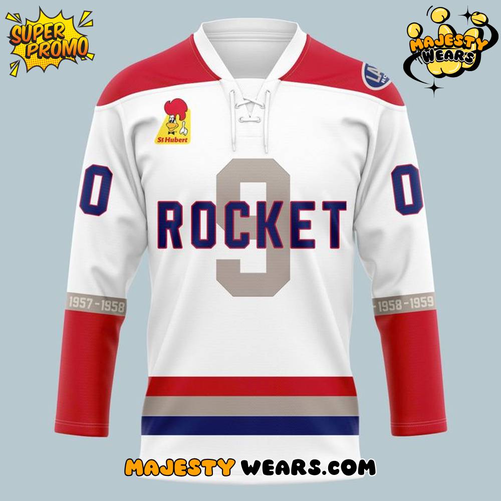 The aesthetic of the Rocket de Laval x The memory of Maurice Richard Custom Hockey Jersey is defined by its clean white base and striking red shoulder yokes, accented by a classic lace-up collar. On the front, the word “ROCKET” is emblazoned across a large, ghosted number 9, serving as a direct nod to Richard’s famous jersey number. This Rocket de Laval x The memory of Maurice Richard Custom Hockey Jersey also includes specialized patches such as the St-Hubert logo on the chest and “1957-1958” and “1958-1959” markers on the sleeves to commemorate specific championship years.