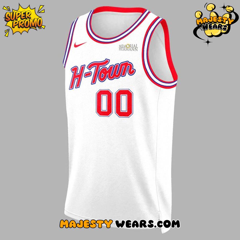 The aesthetic of the Rockets H-Town Jersey is deliberately inspired by the physical championship banners that hang in the Toyota Center rafters, using a crisp white base to make the iconic colors pop. The jersey proudly features the ‘H-TOWN’ wordmark across the chest, rendered in bold red with a black outline, directly mirroring the typography and style of those legendary banners. This visual connection establishes an immediate link to the club’s pinnacle achievements and is an instant identifier of genuine Houston Rockets City Edition apparel, a crucial detail for expert collectors and casual fans alike. The red and black trim along the collar, armholes, and sides further emphasizes the championship banner theme, seamlessly blending nostalgia with the modern demands of a City Edition Custom Basketball Jersey.