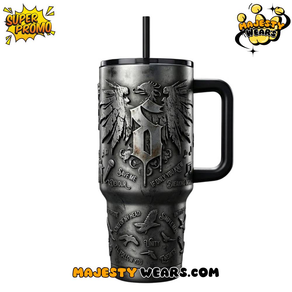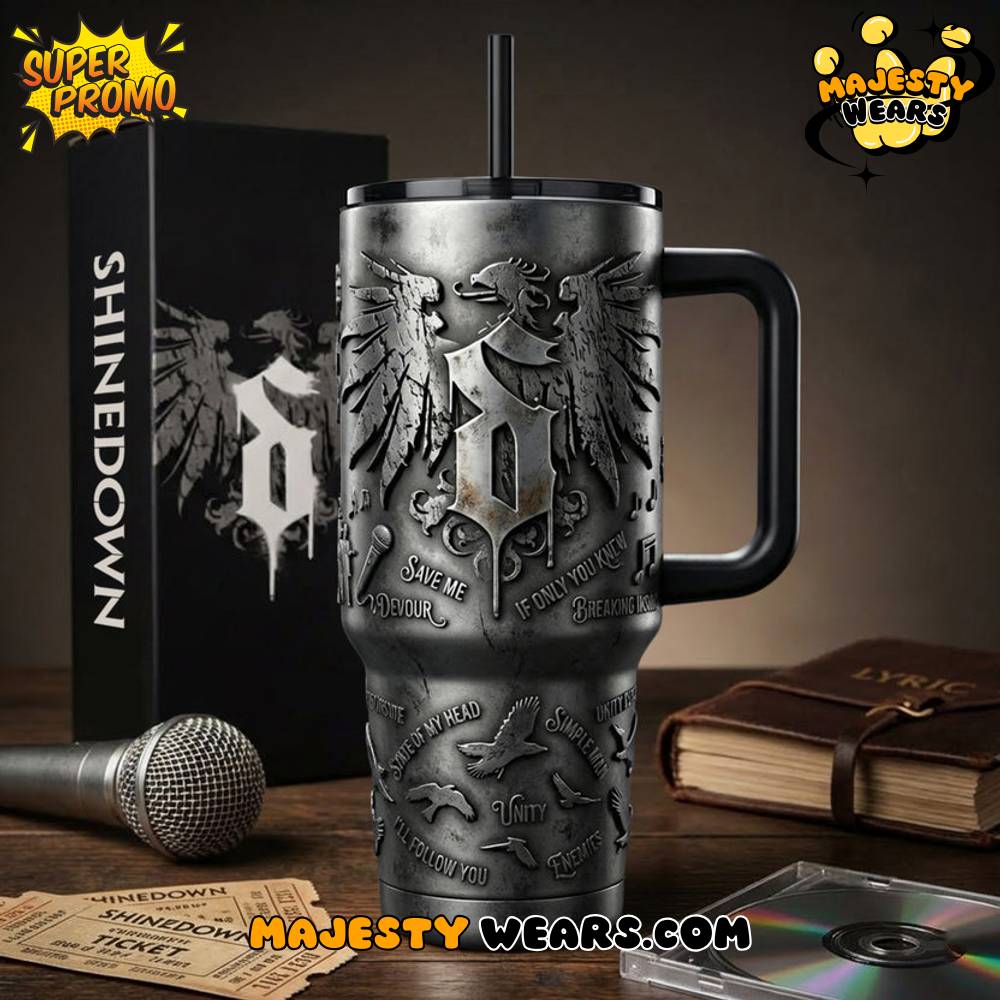 The visual presentation of the Shinedown Special YETI Tumbler is a masterclass in 3D relief artistry, featuring a deeply textured, gunmetal-grey finish that feels like ancient stone. On the front of the Shinedown Special YETI Tumbler, the iconic band logo is prominently raised, flanked by a powerful twin-headed eagle design that exudes a sense of strength and unity. This Shinedown Special YETI Tumbler also incorporates several song titles and lyrical references, such as “Save Me” and “Devour,” woven directly into the industrial landscape of the vessel. Every element of the Shinedown Special YETI Tumbler is rendered with high-precision engraving to ensure a premium, artistic look.