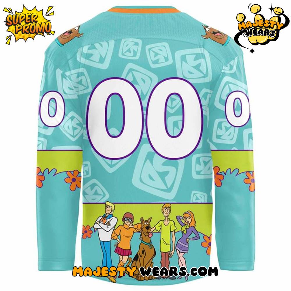 The visual identity of the Sioux Falls Stampede Slooby-Doo Custom Hockey Jersey is defined by its playful integration of the iconic Mystery Machine color palette. Featuring a base that often incorporates shades of teal and lime green, the jersey showcases Scooby-Doo himself integrated with Stampede elements, such as the character wearing a team-branded collar or skating across the chest. This Sioux Falls Stampede Slooby-Doo Custom Hockey Jersey masterfully blends traditional hockey stripes with whimsical “spooky” motifs like bats and cobwebs to match its October debut. The Sioux Falls Stampede Slooby-Doo Custom Hockey Jersey stands out as a colorful and imaginative departure from the team’s standard navy and gold uniforms.