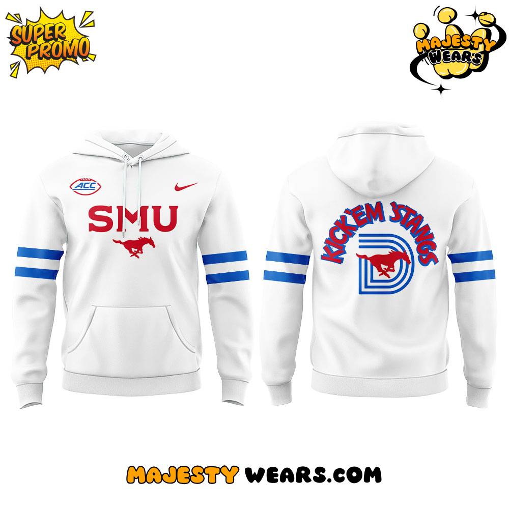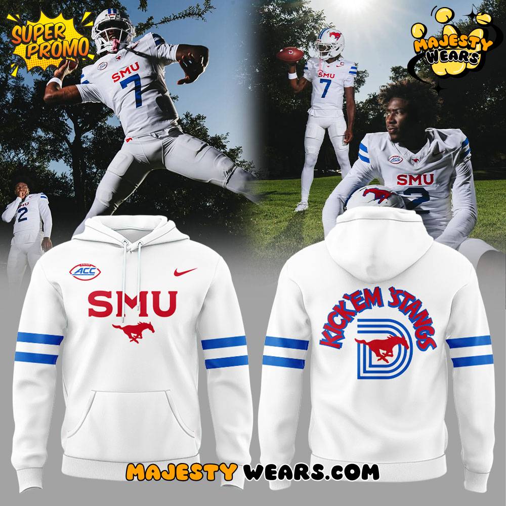 The sheer boldness of the SMU Mustangs All White Uniform 2025 Special Hoodie makes it an instant classic and a highly sought-after piece for the 2025 season. The sleek All White canvas, accented with the traditional red and blue, provides a sophisticated look that transcends typical collegiate gear. Furthermore, the inclusion of the phrase “Kick ‘Em Stangs,” a modern rallying cry favored by some fans and the football team, ensures that this Special Hoodie resonates deeply with the current culture and spirit of the SMU Mustangs program as they aim to “kick” the competition in the ACC.