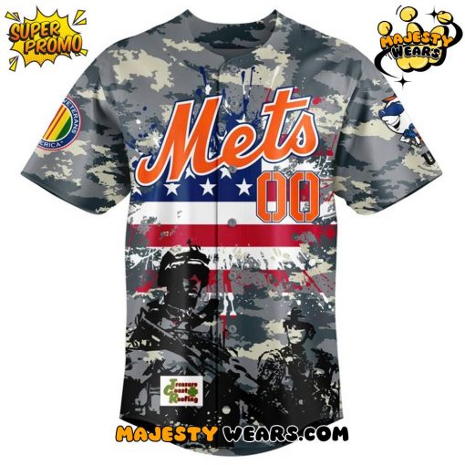 The front of the St. Lucie Mets x Military Appreciation Weekend 2025 Jersey features a dynamic and patriotic design. The upper half of the jersey is adorned with a gray and white camouflage pattern, while the lower half transitions into bold red and white stripes, creating a striking American flag motif. The word “Mets” is prominently displayed across the chest in orange, outlined in blue, ensuring team recognition. Below the “Mets” logo, the customizable number “00” is featured, inviting personalization, making this a truly unique St. Lucie Mets Military Jersey.