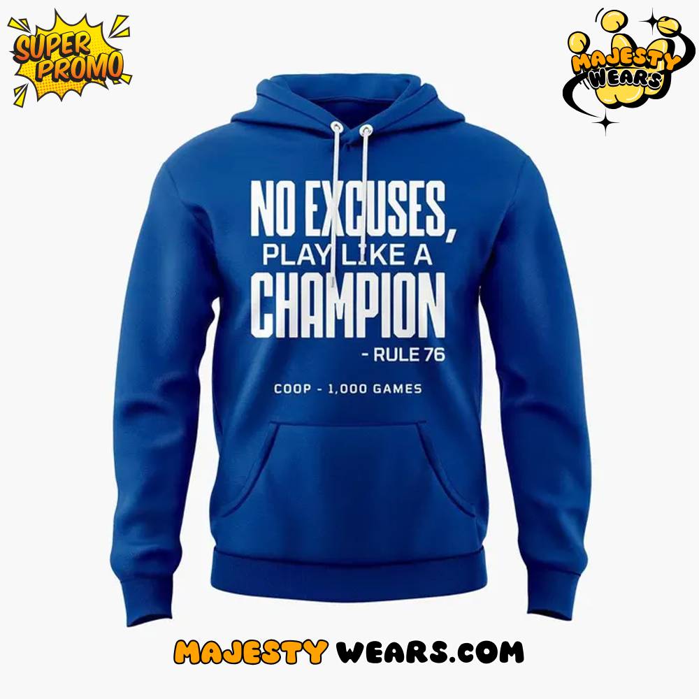 The design of the Tampa Bay Lightning “No Excuses, Play Like a Champion” Hoodie is centered on a classic navy blue or black base that perfectly showcases the bold white and silver graphics. On the front of the Tampa Bay Lightning “No Excuses, Play Like a Champion” Hoodie, the phrase “Rule 76: No Excuses. Play Like a Champion” is prominently displayed in a bold, athletic typeface that commands immediate attention. This Tampa Bay Lightning “No Excuses, Play Like a Champion” Hoodie also incorporates the iconic Lightning bolt logo, signifying the official collaboration between the coaching staff and the team’s identity.