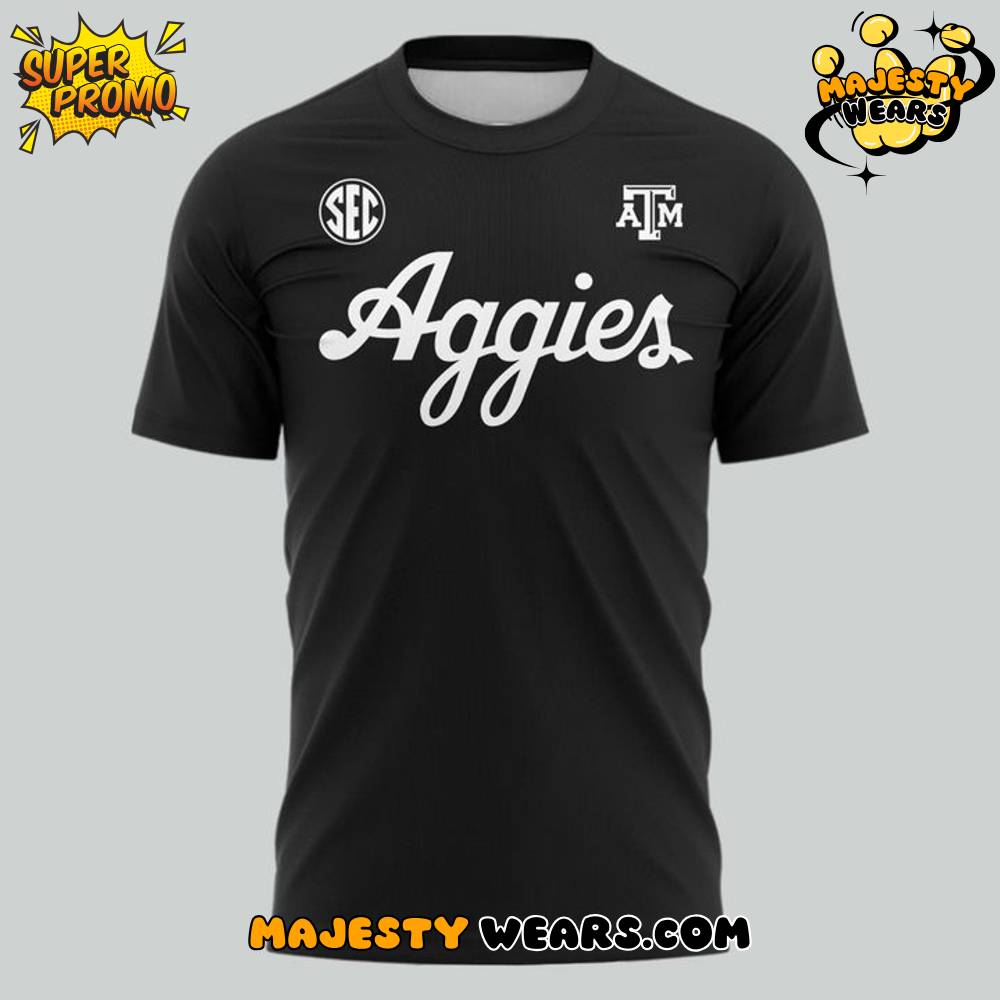 The design of the Texas A&M Aggies Dark Mode ‘Blackout’ Special Hoodie is meticulously detailed to capture the essence of Aggie pride and the “blackout” theme. The front of the hoodie, as depicted in the images, features a sleek, dark black background, the quintessential “dark mode” aesthetic. Boldly displayed is a script “Aggies” in a contrasting white, immediately drawing attention and establishing team loyalty. Positioned above the script are the official logos: the SEC logo and the distinctive ATM mark, both subtly integrated to certify the authenticity and conference affiliation of this Texas A&M Aggies gear, making it clear this is a high-quality, officially themed product.