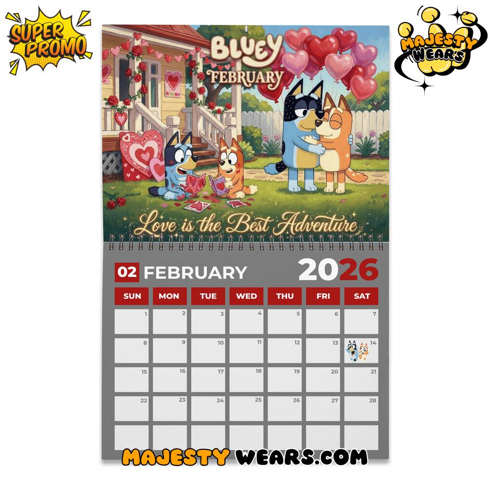 Moving into the month of love, the February spread of the The Bluey 2026 Wall Hanging Calendar shows the family sharing cards and balloons under the header “Love is the Best Adventure”. The layout of The Bluey 2026 Wall Hanging Calendar features a clean, white date grid that contrasts perfectly with the vibrant headers, making it easy to read from a distance. Additionally, the The Bluey 2026 Wall Hanging Calendar is equipped with a sturdy metal spiral binding that allows for 360-degree page rotation without damaging the beautiful artwork. Every page transition is smooth, reflecting the high manufacturing standards expected of official show merchandise.