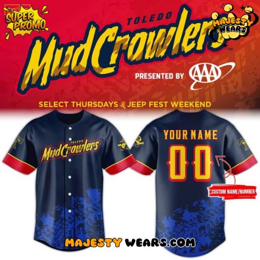 Prominently displayed across the chest of the Toledo Mud Hens x Crawlers Adult Replica Jersey is the “Toledo MudCrawlers” logo in bold yellow and blue lettering, creating a focal point that proudly represents this special collaboration. The sleeves feature red cuffs, adding a pop of contrasting color, and additional team-related patches. The overall design harmoniously blends the established identity of the Toledo Mud Hens with the fresh, adventurous spirit of the “MudCrawlers,” creating a visually engaging and cohesive look.