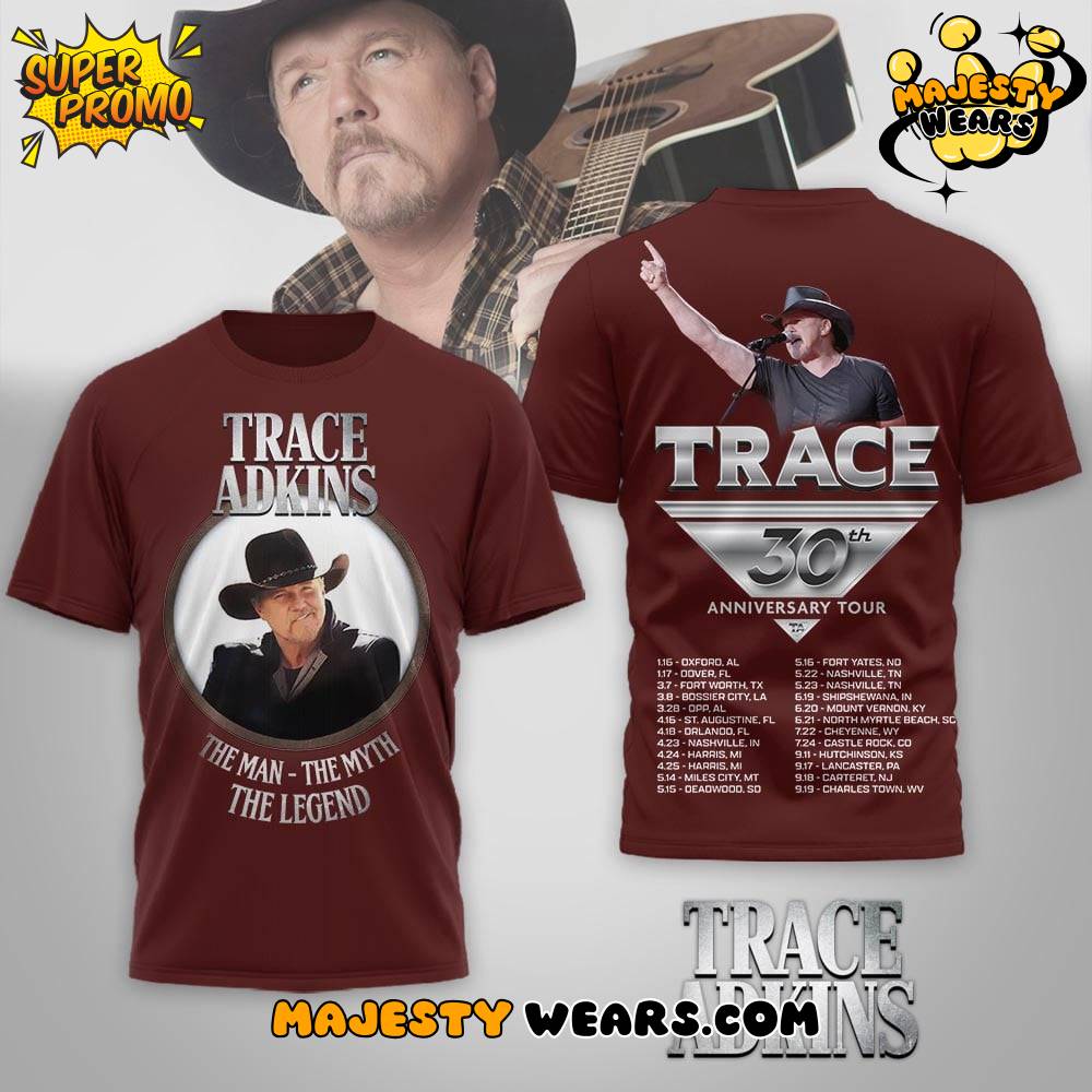 Celebrate three decades of baritone-voiced excellence with the official Trace Adkins 30th Anniversary Tour T-Shirt, a premium commemorative garment marking a milestone that few artists ever reach. As the “Honky Tonk Badonkadonk” singer kicks off his 24-date headlining run in early 2026, this Trace Adkins 30th Anniversary Tour T-Shirt serves as the definitive tribute to a career that began with the platinum-certified 1996 debut, Dreamin’ Out Loud. Fans attending historic stops like the Ryman Auditorium or Billy Bob’s Texas will find this Trace Adkins 30th Anniversary Tour T-Shirt to be a must-have souvenir that honors the grit and honesty of an American country icon.