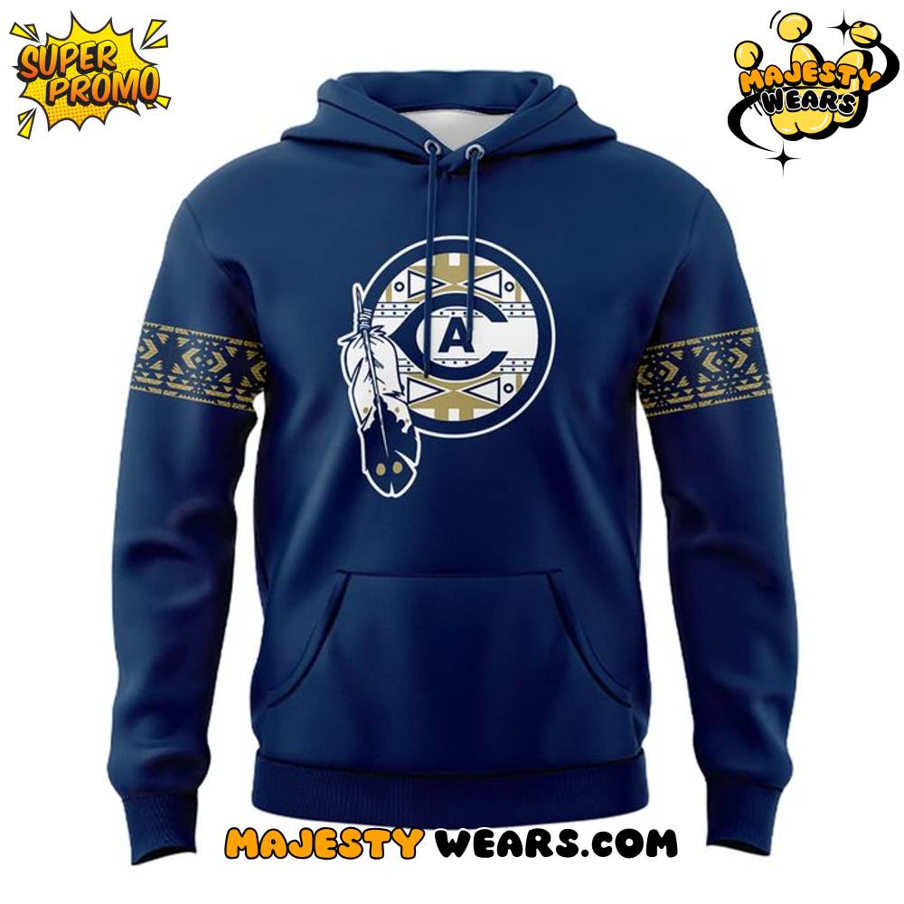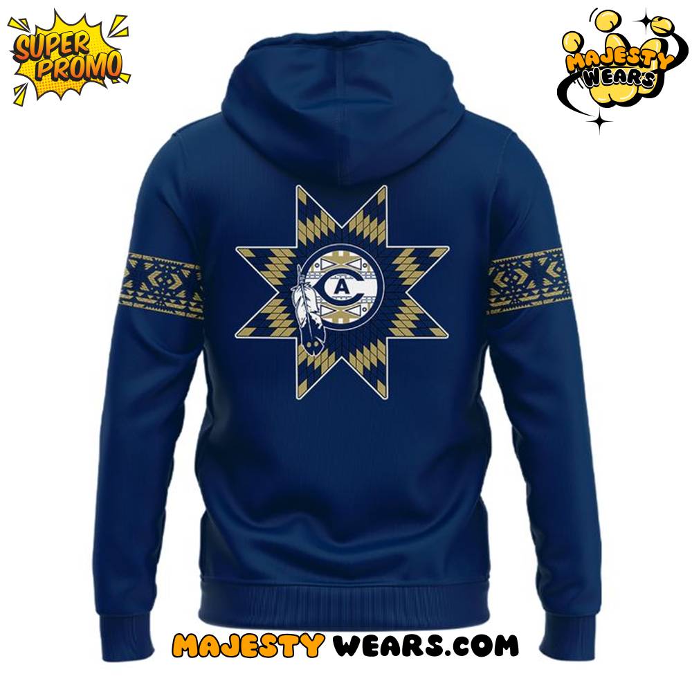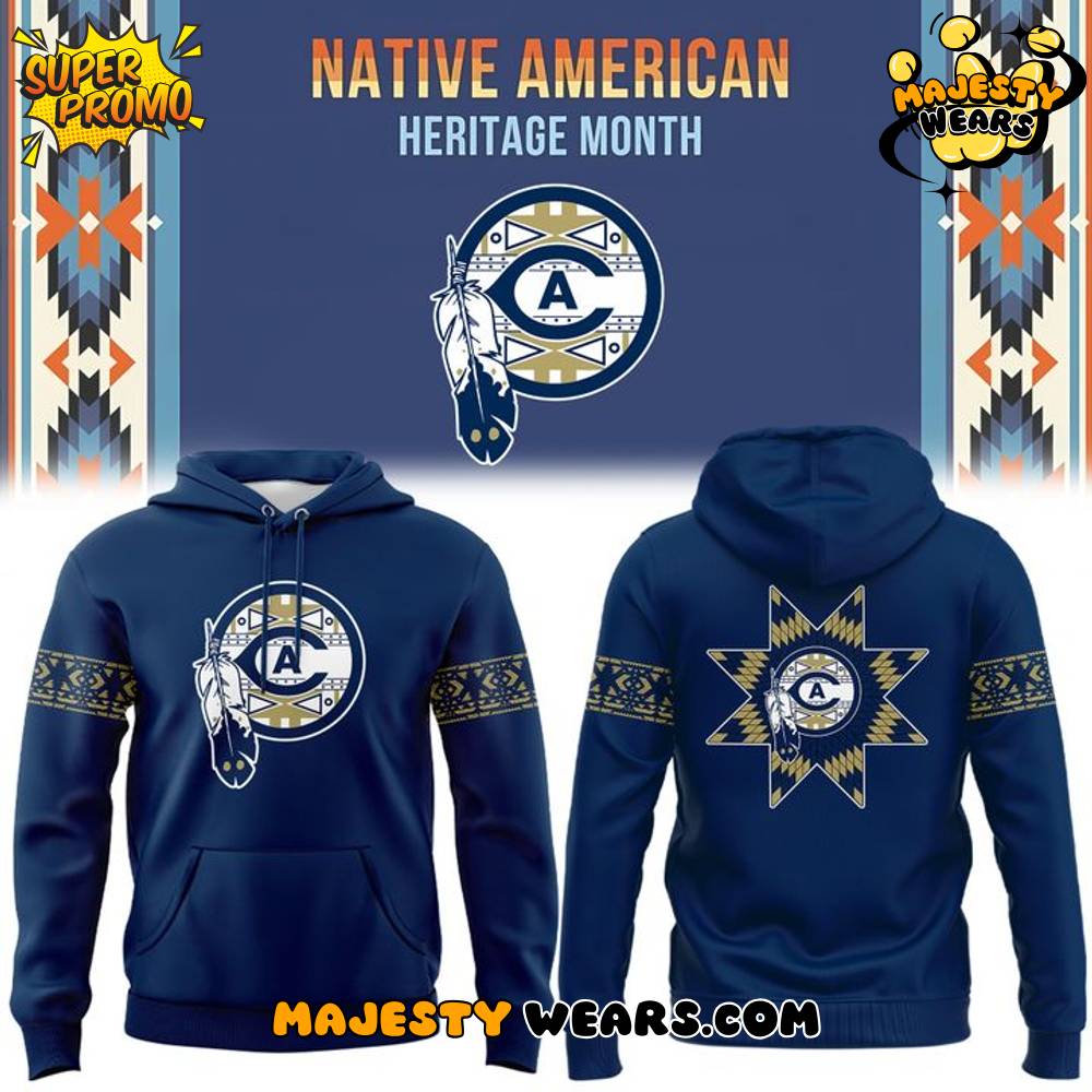 The design of the UC Davis Aggies Native American Heritage Month Hoodie is a masterclass in combining school branding with respectful, culturally inspired iconography. The front of the navy-blue hoodie features a circular emblem where the classic UC Davis “A” logo is centrally positioned within a ring of traditional Native American geometric patterns. A stylized feather, a potent symbol in many Native cultures, arcs gracefully across this central motif, grounding the design in deep cultural respect. The combination of the school’s identity with these significant cultural elements makes this a highly sought-after and collectible piece of UC Davis Aggies apparel.