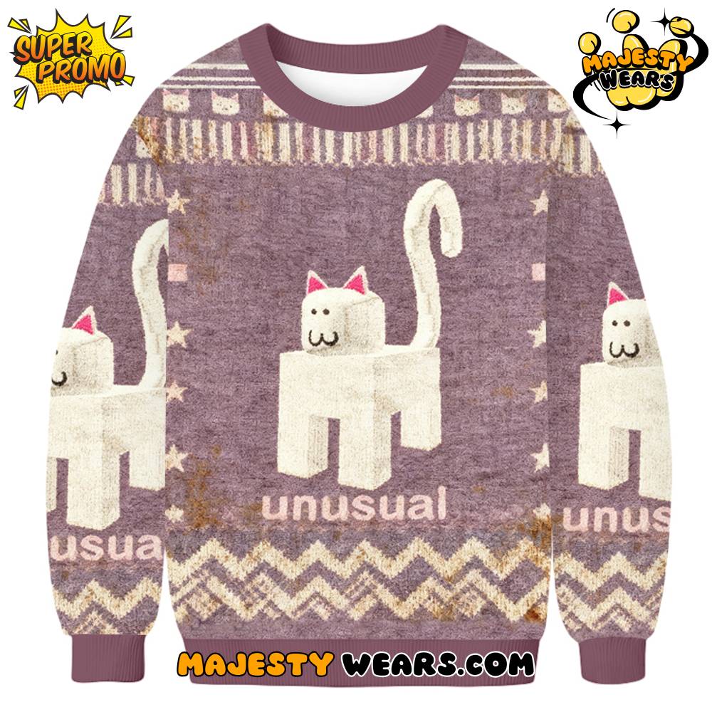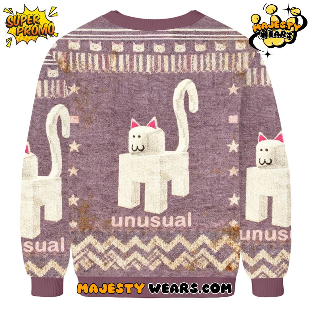 The visual artistry of the Unusual Robot Cat Ugly Christmas Sweater features a striking, blocky white feline silhouette centered on a muted purple backdrop. On the front, the Unusual Robot Cat Ugly Christmas Sweater showcases the iconic “:3” emoticon face, which gives the character its signature “robot” or “unusual” personality. This central graphic on the Unusual Robot Cat Ugly Christmas Sweater is rendered with a unique pixel-knit texture that emphasizes its digital roots while maintaining a cozy, handmade feel.