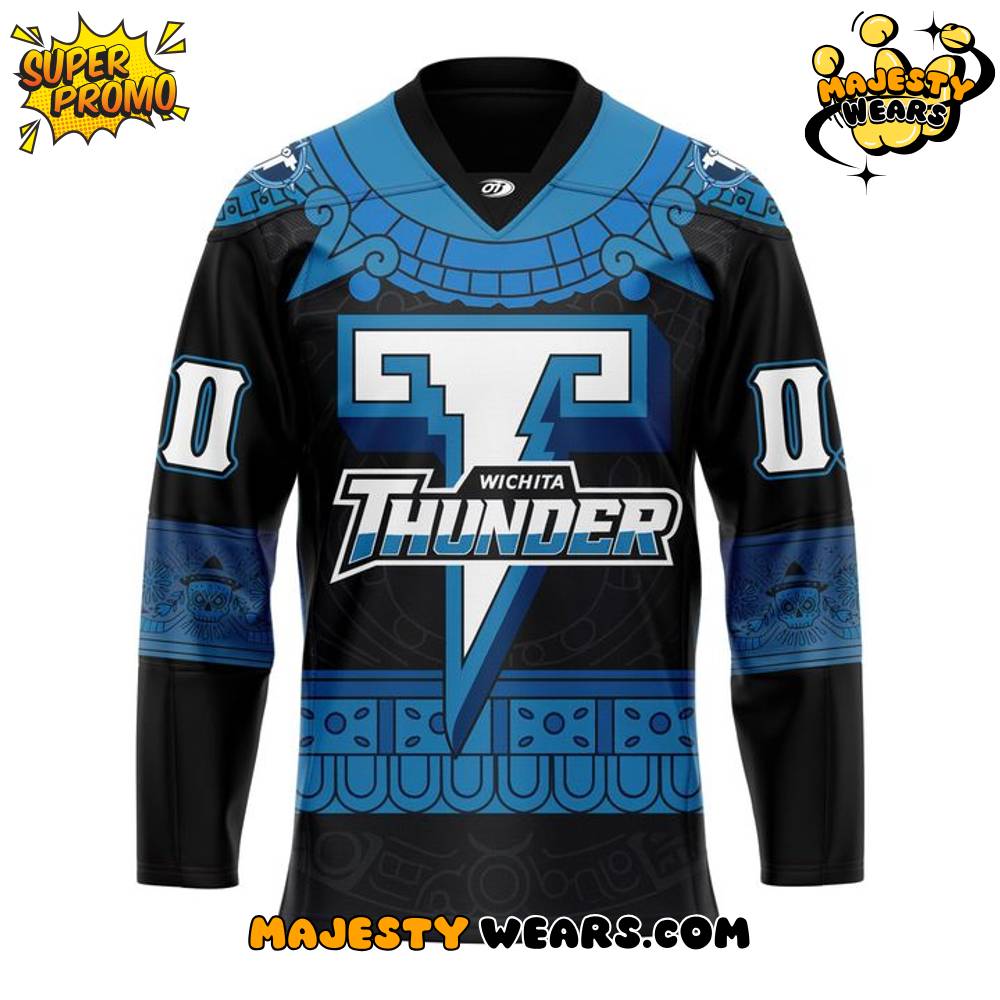 Examining the visual elements in detail, the jersey’s shoulders and lower hem are adorned with geometric patterns reminiscent of Aztec or Mayan designs, which are commonly associated with the Dia de los Muertos celebration. These continuous patterns on the custom hockey jersey elevate the visual impact and showcase the depth of design Expertise invested into this specialty uniform. The bold black base color provides a perfect canvas for the vibrant turquoise and white accents, ensuring the Wichita Thunder logo and the personal customization on the back, marked for “Your Name” and “00,” stand out sharply. This is a garment designed for performance and spectacle, promising a memorable Experience for the wearer.