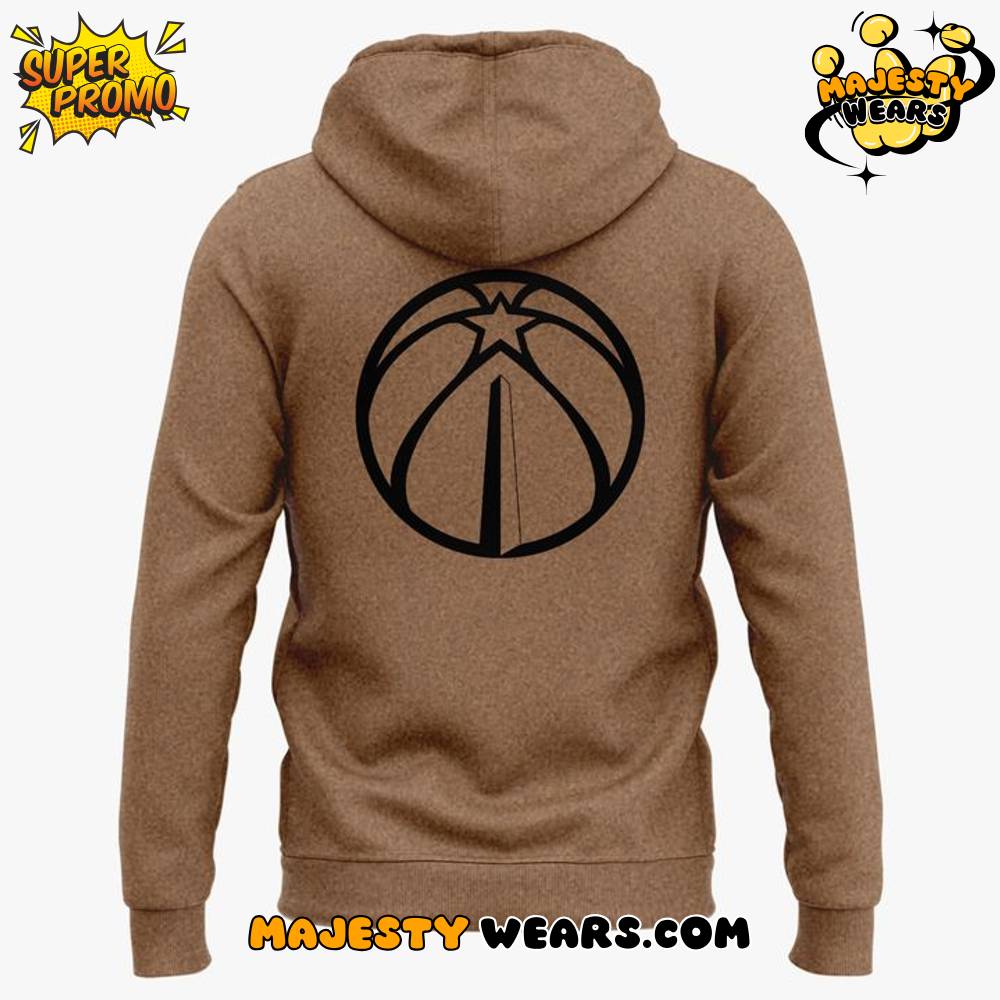 The back of the Wizards Cherry Special Brown Hoodie features a large, striking outline of the classic Washington Wizards basketball logo. This iconic image, representing the Capitol Building’s dome within a basketball, is rendered in bold black lines. The logo is kept simple and free of color fill, preserving the garment’s overall monochromatic scheme and allowing the rich brown fabric to maintain its focus. This strategic, minimalist use of team iconography on the back perfectly complements the subtle branding on the front, resulting in a cohesive, stylish, and high-quality brown hoodie that serves as a modern staple for any dedicated fan.